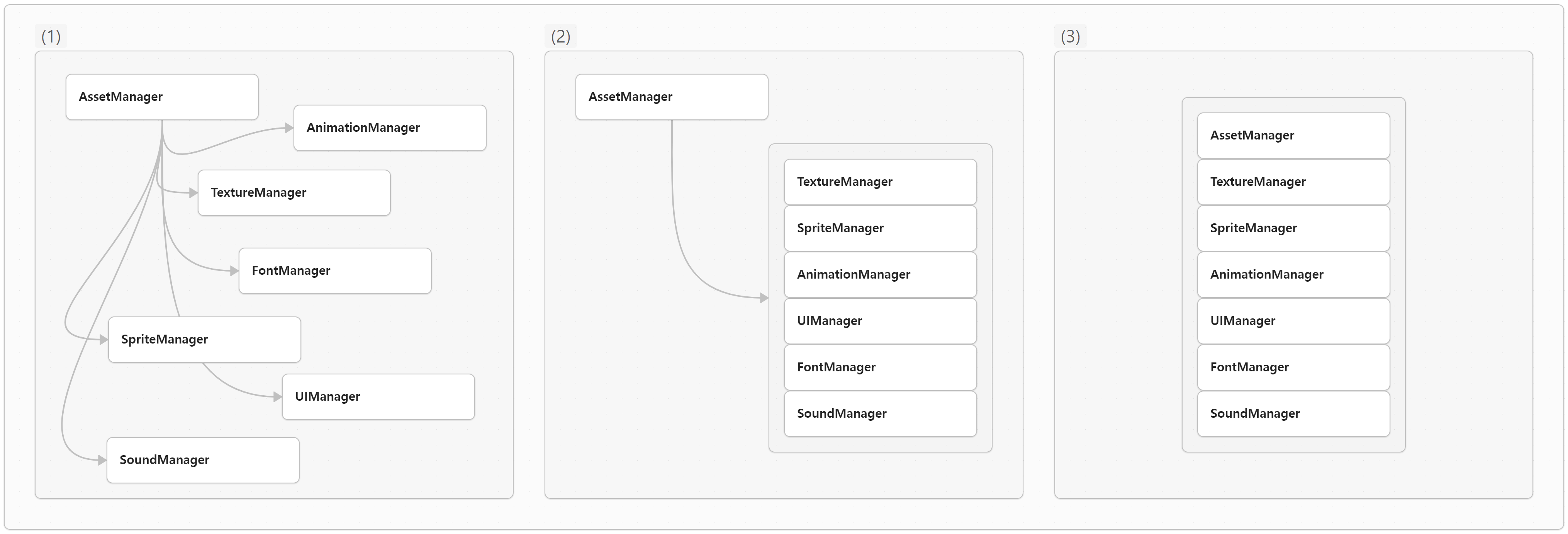 CAssetManager is a singleton that stores various resource managers required for game execution, such as textures, sprites, animations, UI, fonts, and sounds. Through this, all necessary resources can be accessed and managed consistently. During the development, I considered several different implementation approaches, and I’ve summarized their pros and cons below.