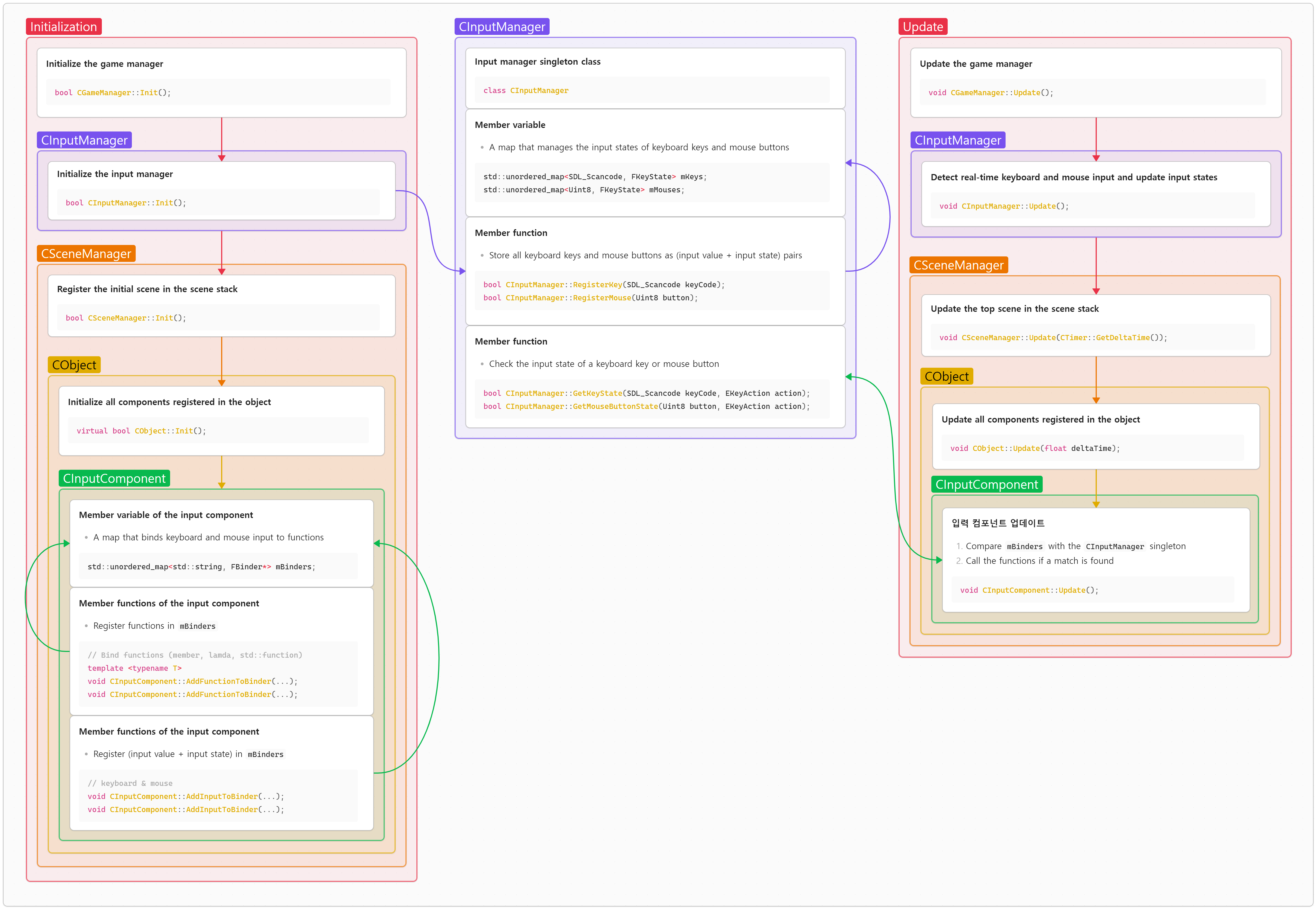 The in-game input processing system consists of CInputManager and CInputComponent. It functions using the keyboard and mouse input states, along with the structures that bind these inputs. Each object binds the inputs it needs, and executes the corresponding callback functions in response to the inputs received.
