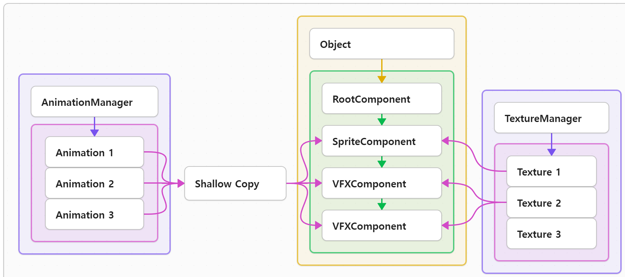 By using the CSpriteComponent and CVFXComponent, the visual elements of objects can be managed efficiently and flexibly. The texture structure managed by std::shared_ptroptimizes resources, and animations cloned with shallow copies allow independent control per object.
