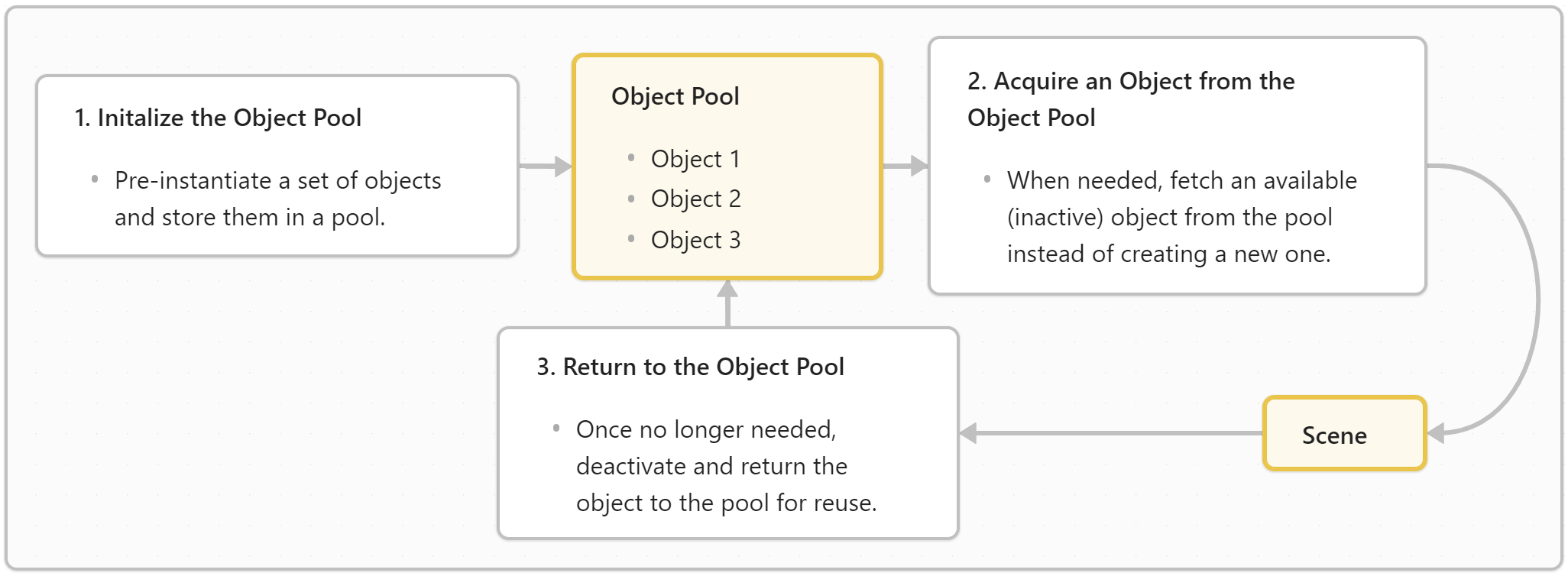 Object Pooling is a powerful technique for managing frequently created and destroyed objects at runtime. However, pre-creating too many objects can lead to significant memory waste. It’s essential to estimate how many objects will be needed during runtime. Based on that estimate, an appropriate pool size should be selected to avoid over-allocation. Finally, as seen in my two projects demonstrating object pooling, selecting the right data structure for the pool is crucial, depending on the specific use case.