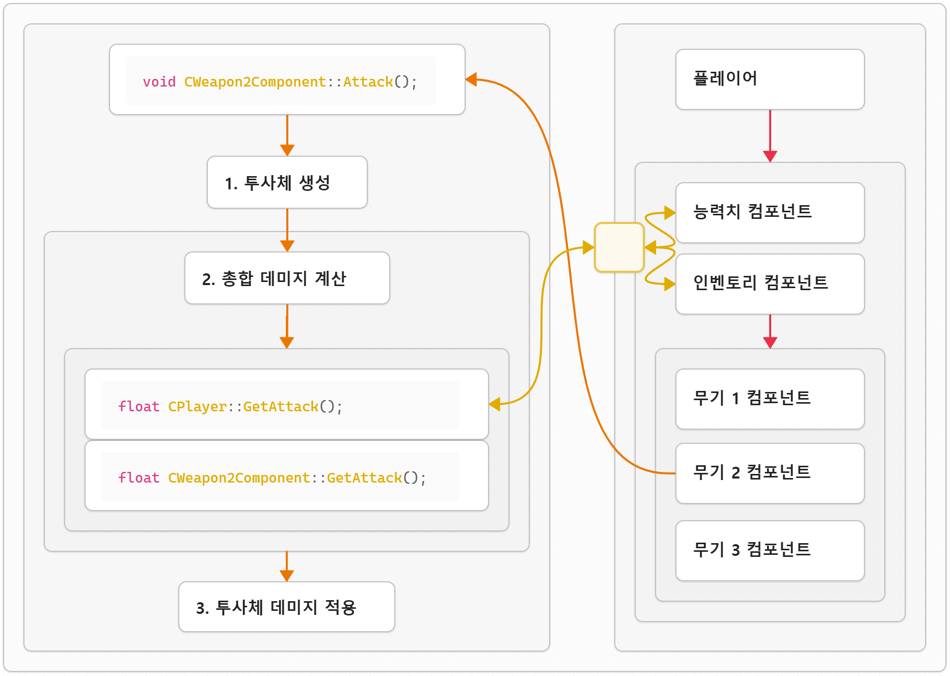 플레이어와 무기의 관계를 간결하게 나타낸 연관성 설계도입니다. 무기로 공격할 때는 투사체를 생성하고, 플레이어와 무기의 공격력을 합산한 총 데미지를 계산하여 투사체에 적용합니다.