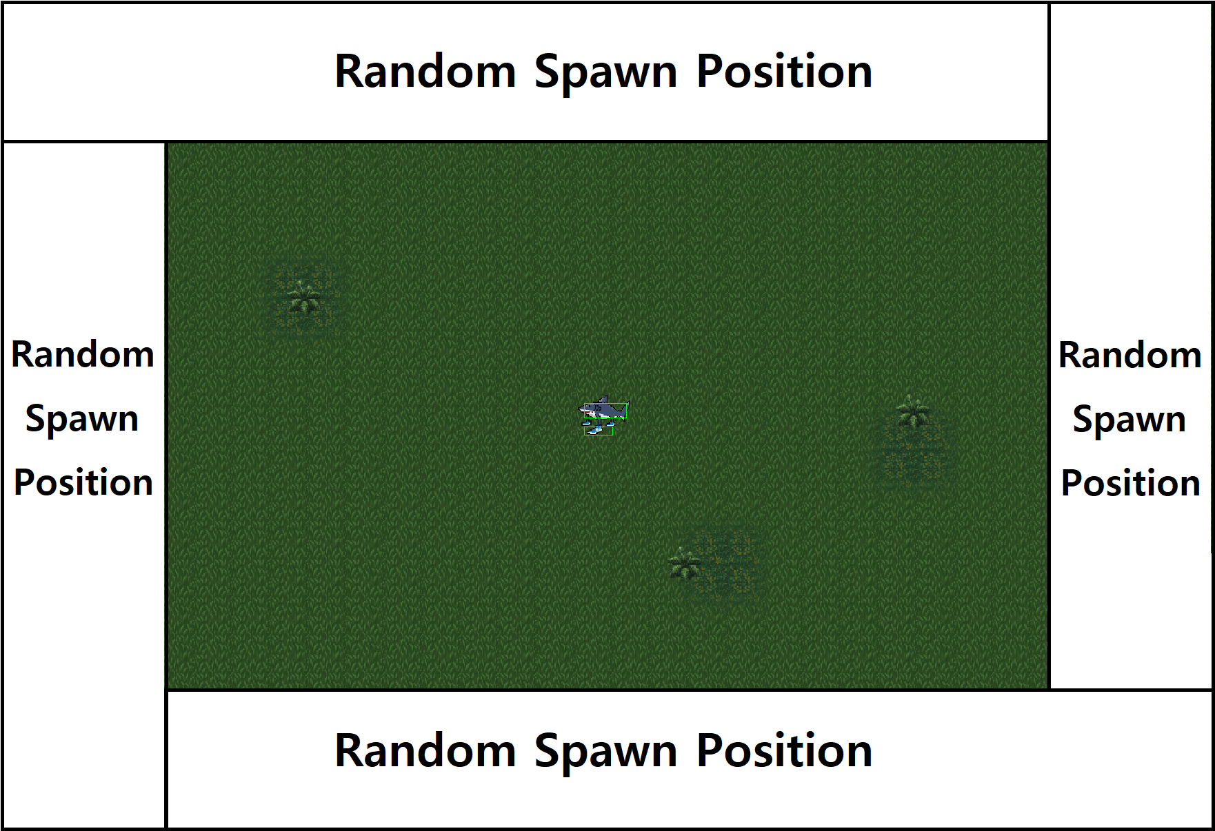 CMobSpawner 클래스는 카메라 주변 일정 범위 내에서 몹을 무작위로 소환합니다. 카메라 주변을 4개의 테두리 영역으로 나눈 뒤, 그 중 하나를 선택하여 해당 영역 안에서 랜덤한 위치로 소환함으로써, 플레이어 주변에 동등한 확률로 적이 등장하도록 합니다.