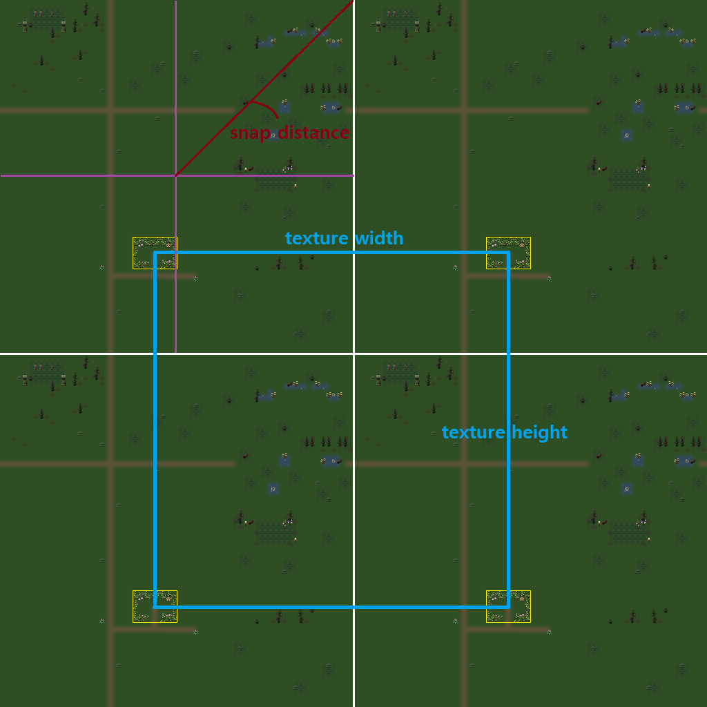 위 이미지는 실제 구현에서는 단일 텍스처를 사용하지만, 시각적 이해를 돕기 위해 4개의 텍스처를 결합한 예시로 구성했습니다. 이를 통해 동일한 환경 오브젝트 간 간격, 맵 단위 배치, 그리고 위치 보정 판단 기준인 일정 거리(