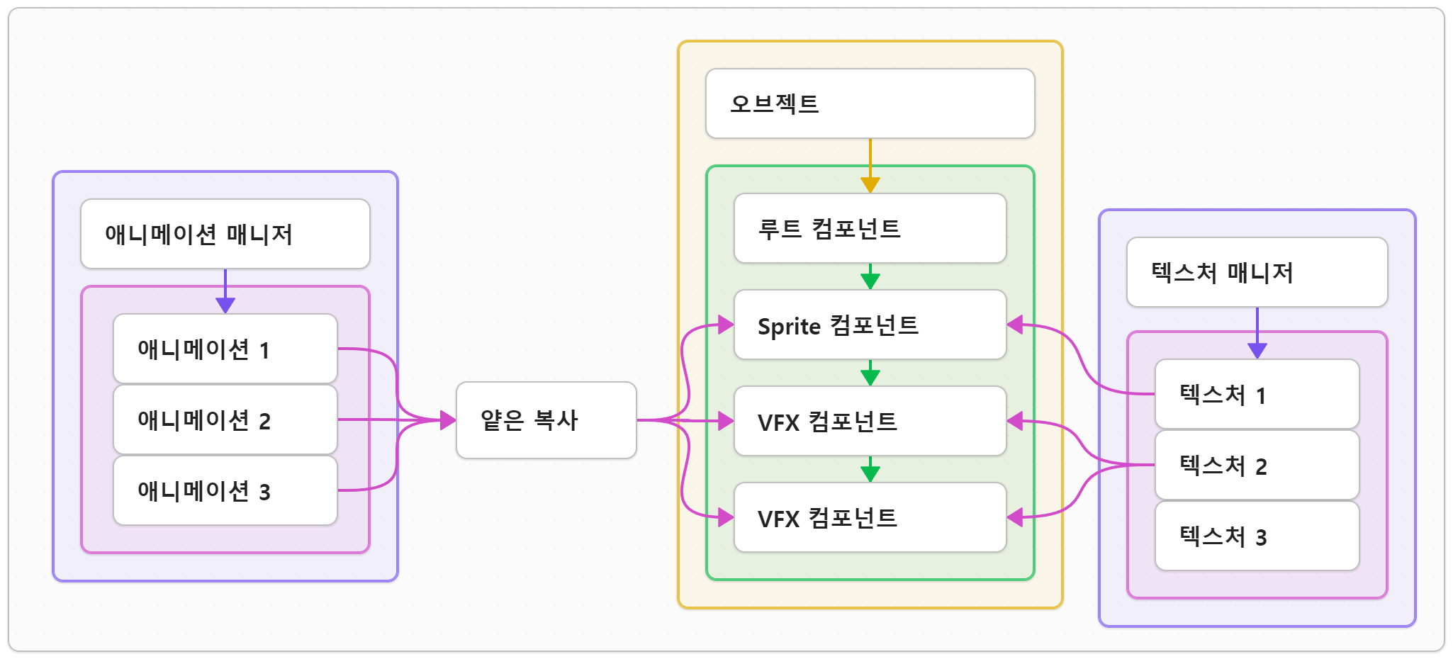 여러 오브젝트가 같은 애니메이션을 공유하면 동작이 동기화되어 동시에 실행되므로 개별 제어를 위해 얕은 복사 방식을 사용하며, 텍스처는 std::shared_ptr를 사용해 여러 컴포넌트에서 공유합니다.