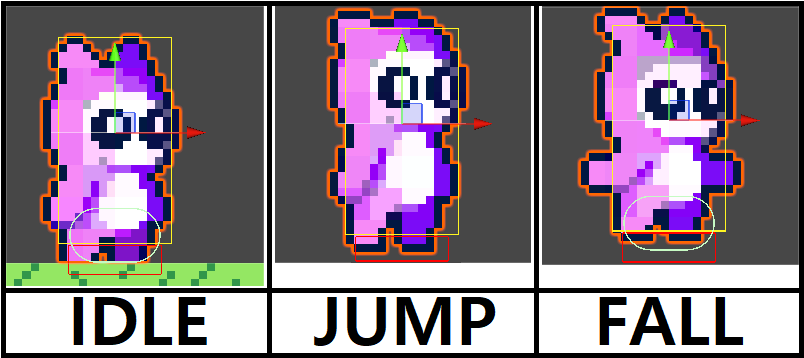 초록색 캡슐은 지면 충돌을 담당하는 주요bool IsGrounded() { if (!m_PlayerFootCollider.enabled) return false; Collider2D groundCollider = Physics2D.OverlapArea(m_FeetPoint1.position, m_FeetPoint2.position, m_PlatformLayerMask); return groundCollider != null; } void UpdateFootColliderState() { if (!IsGrounded()) { if (m_Rb.velocity.y > 0.0f) m_PlayerFootCollider.enabled = false; else m_PlayerFootCollider.enabled = true; } }