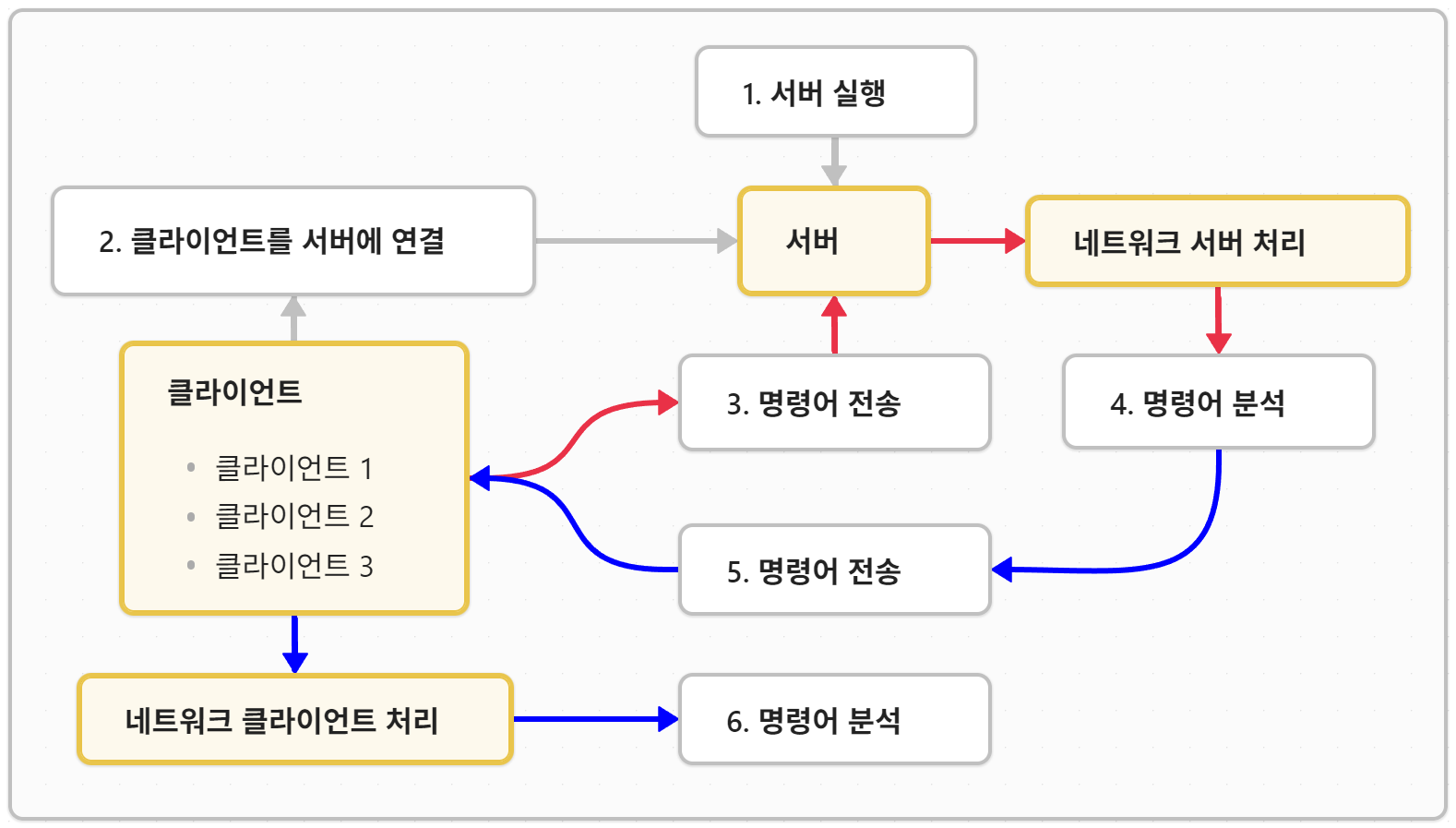 이 프로젝트는 수업 과제의 일환으로, 제공된 네트워크 프레임워크를 확장하여 클라이언트-서버 간 움직임 동기화, 입력 처리, 그리고 서버와 클라이언트 양쪽의 명령 송수신 시스템을 직접 구현했습니다. 실시간 멀티플레이 상호작용에 적합한 반응성 높고 모듈화된 설계를 구축하는데 중점을 두었습니다.