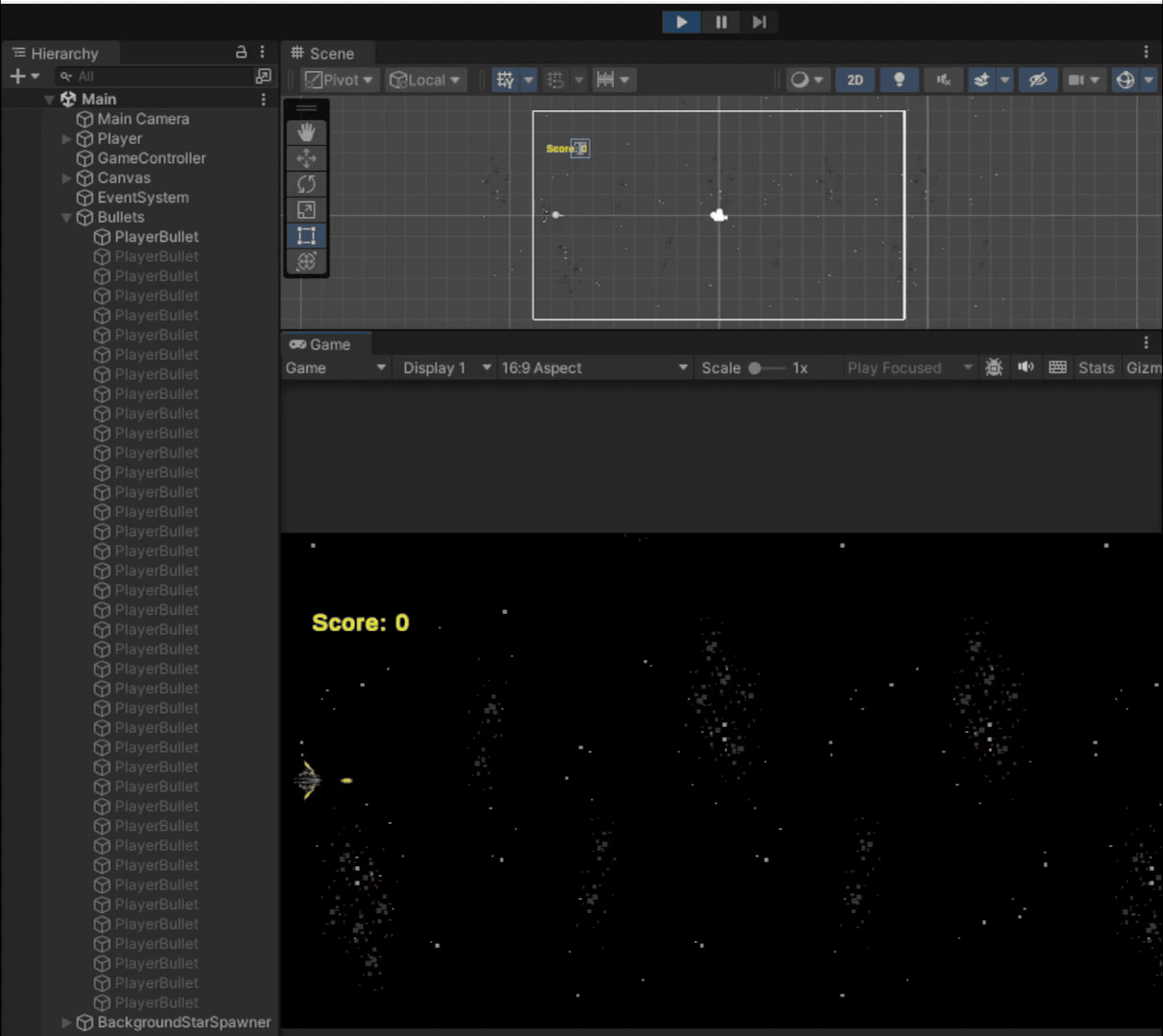 SpaceShip Battle의 BulletManager 클래스는 큐 기반 풀 구조를 사용해 오브젝트 풀링으로 총알을 재사용합니다. 이는 위의 프로젝트 Infinite Runners와 달리 무작위 선택이 필요하지 않기 때문입니다.