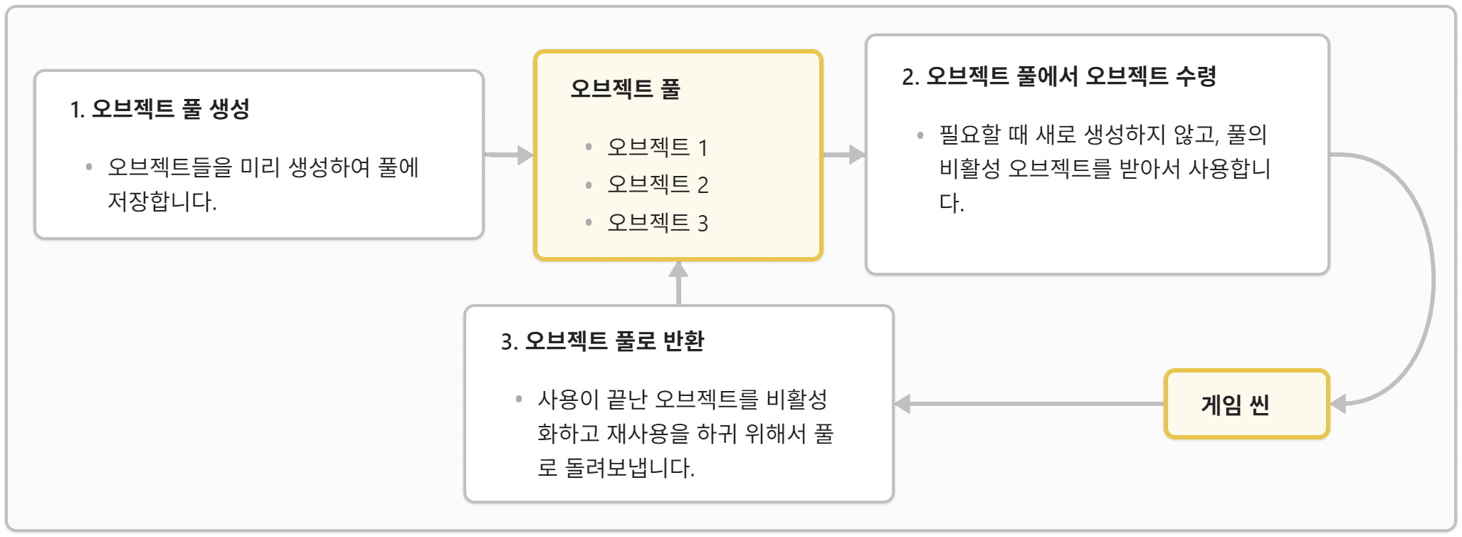 오브젝트 풀링은 강력한 기법으로, 런타임에 자주 생성되고 소멸되는 오브젝트를 효율적으로 관리합니다. 그러나 너무 많은 오브젝트를 사전에 생성하면 상당한 메모리 낭비로 이어질 수 있습니다. 따라서 런타임 중에 필요한 오브젝트 수를 신중히 예측하고, 그에 맞춰 적절한 풀 크기를 설정하여 과한 메모리 할당을 방지하는 것이 중요합니다. 마지막으로, 제 두 프로젝트의 오브젝트 풀링 적용 사례에서 볼 수 있듯이, 상황에 따라 풀에 맞는 적합한 자료 구조를 선택하는 것도 매우 중요합니다.